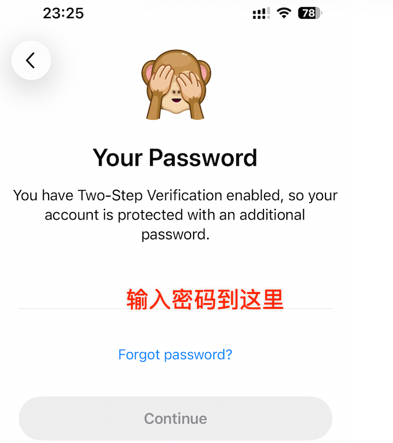 4、最后将密码填入密码框,点击 Continue,完成 TG 成品号登录