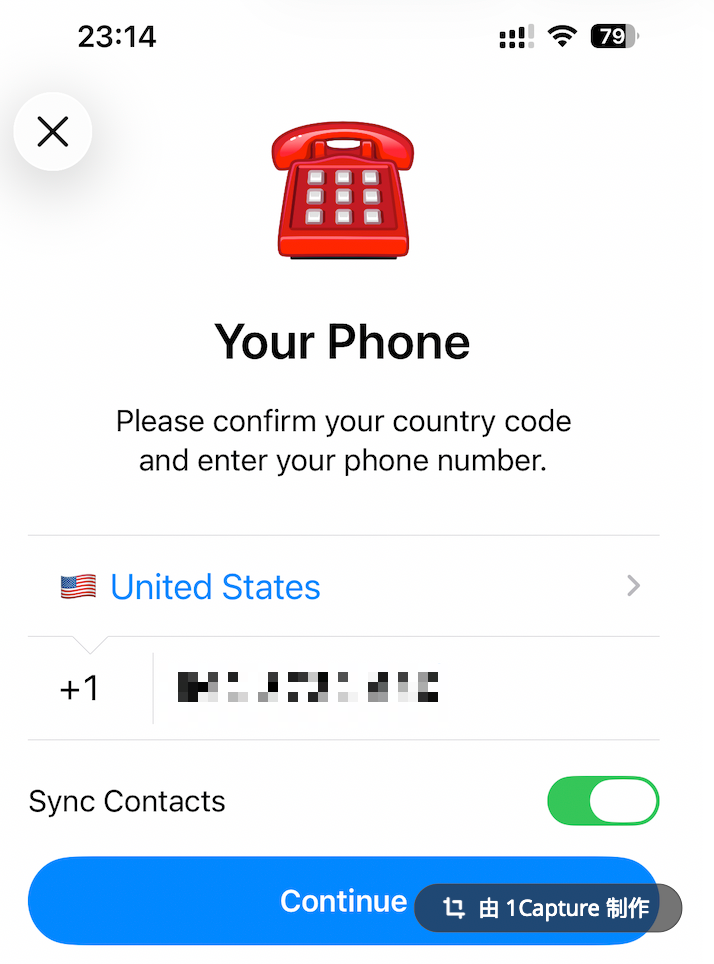 1、复制成品号的电话号码(+号一起复制),填入手机号输入框,点击 Continue